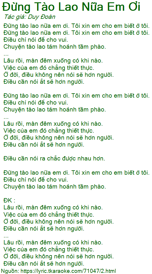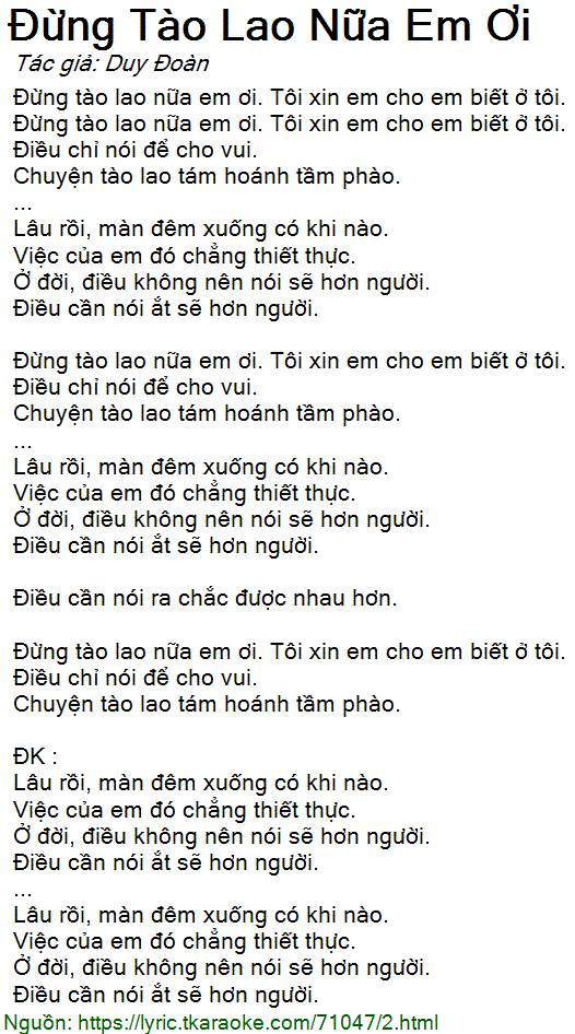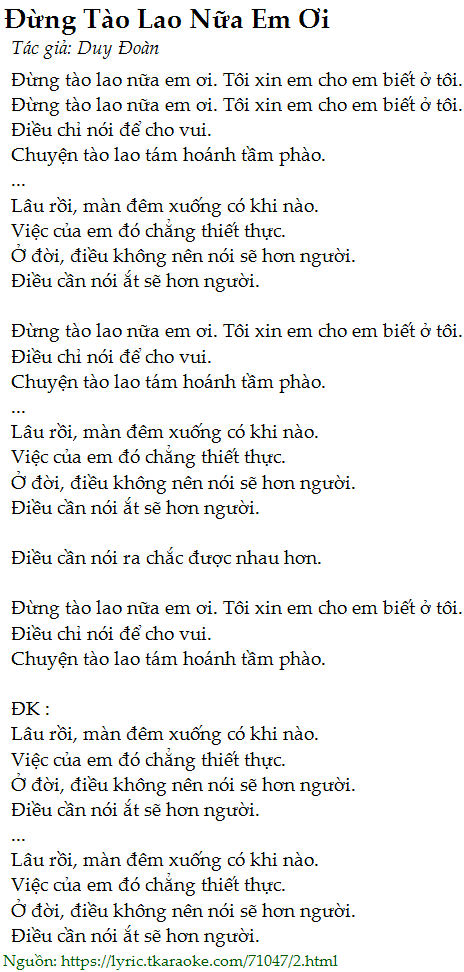 Đừng tào lao nữa em ơi. Tôi xin em cho em biết ở tôi.
