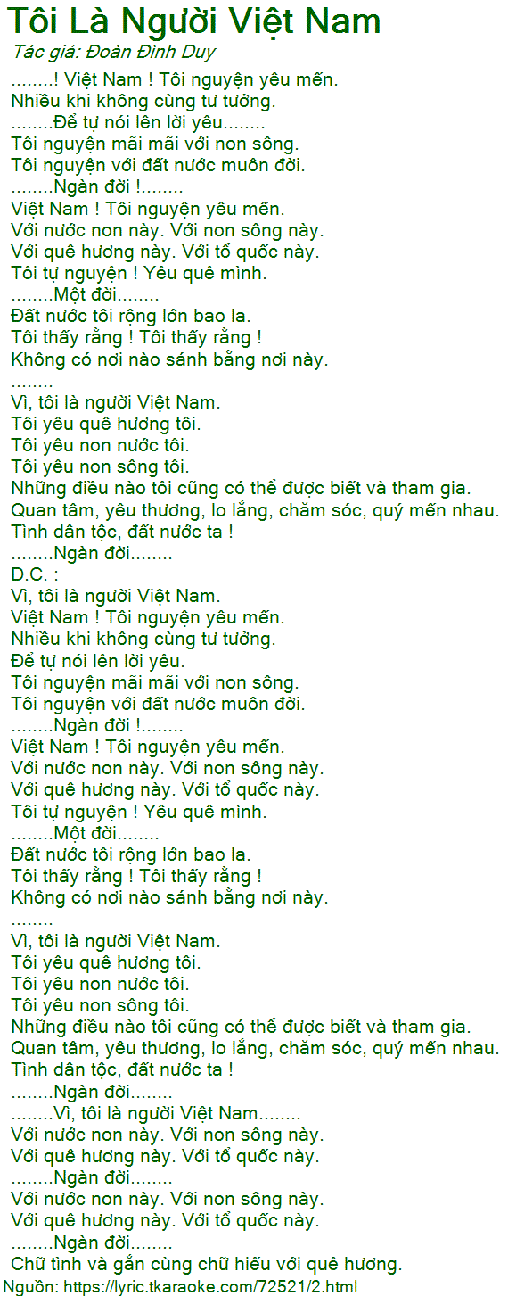 ........! Việt Nam ! Tôi nguyện yêu mến.