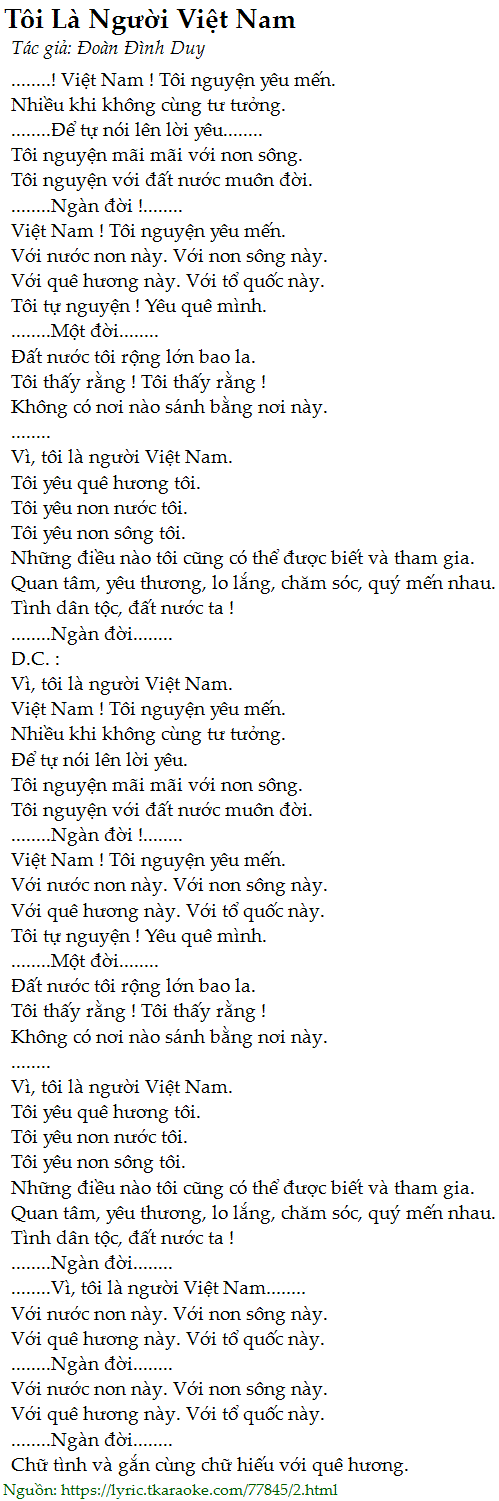 ........! Việt Nam ! Tôi nguyện yêu mến.
