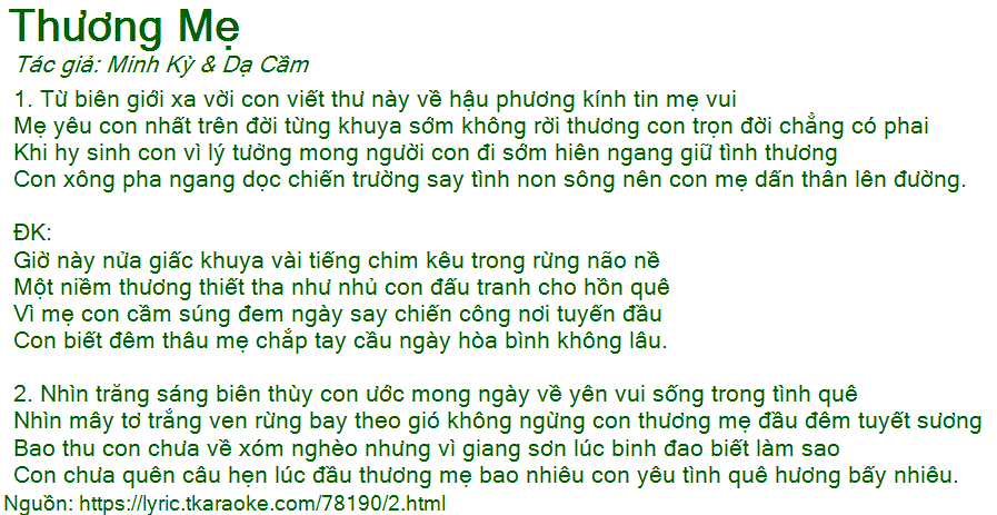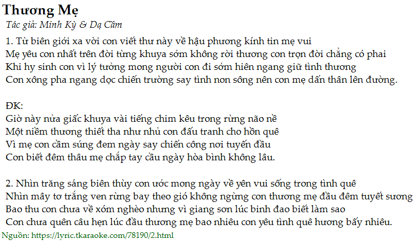 Con, xông pha, ngang dọc chiến trường, say, tình non sông, nên con mẹ, dấn thân lên, đường.