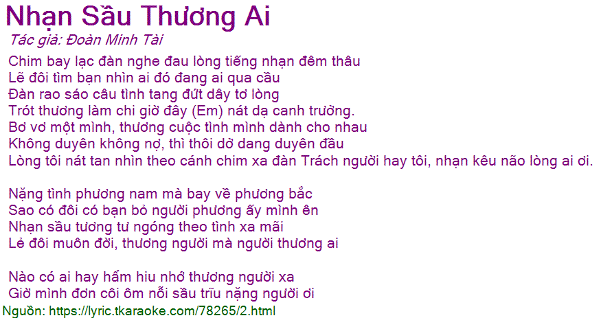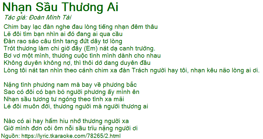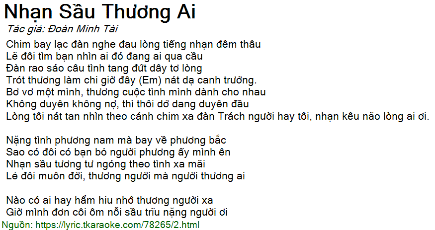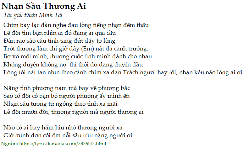 Lòng tôi nát tan nhìn theo cánh chim xa đàn Trách người hay tôi, nhạn kêu não lòng ai ơi.