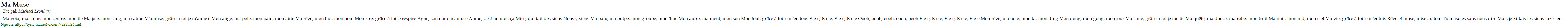 Ma voix, ma sœur, mon centre, mon île Ma joie, mon sang, ma calme M'amuse, grâce à toi je m'amuse Mon ange, ma pote, mon pain, mon aide Ma rêve, mon but, mon nom Mon rire, grâce à toi je respire Agne, son nom m'amuse Aume, c'est un mot, ça Mise, qui fait des siens Nous y siens Ma paix, ma pulpe, mon groupe, mon âme Mon autre, ma meuf, mon son Mon tout, grâce à toi je m'en fous E-e-e, E-e-e, E-e-e, E-e-e Oooh, oooh, oooh, oooh, oooh E-e-e, E-e-e, E-e-e, E-e-e, E-e-e Mon rêve, ma note, mon ki, mon ding Mon dong, mon gong, mon jour Ma cime, grâce à toi je me lis Ma quête, ma douce, ma robe, mon fruit Ma nuit, mon nid, mon ciel Ma vie, grâce à toi je m'enfuis Rêve et muse, mise au loin Tu m'isoles sans nous dire Mais je kiffais les siens Les siens