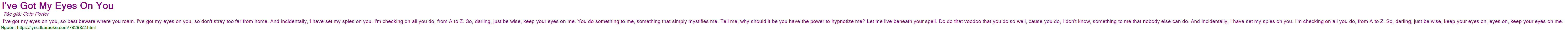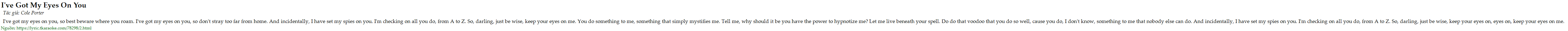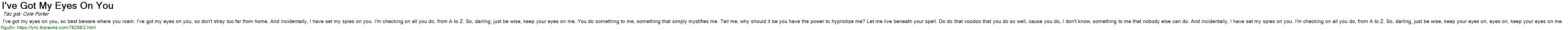 I've got my eyes on you, so best beware where you roam. I've got my eyes on you, so don't stray too far from home. And incidentally, I have set my spies on you. I'm checking on all you do, from A to Z. So, darling, just be wise, keep your eyes on me. You do something to me, something that simply mystifies me. Tell me, why should it be you have the power to hypnotize me? Let me live beneath your spell. Do do that voodoo that you do so well, cause you do, I don't know, something to me that nobody else can do. And incidentally, I have set my spies on you. I'm checking on all you do, from A to Z. So, darling, just be wise, keep your eyes on, eyes on, keep your eyes on me.