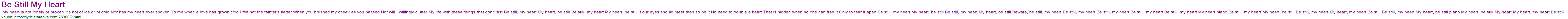My heart is not lonely or broken It's not of ice or of gold Nor has my heart ever spoken To me when a love has grown cold I felt not the fainter's flatter When you brushed my cheek as you passed Nor will I willingly clutter My life with these things that don't last Be still, my heart My heart, be still Be still, my heart My heart, be still If our eyes should meet then so be it No need to trouble a heart That is hidden when no one can free it Only to tear it apart Be still, my heart My heart, be still Be still, my heart My heart, be still Beware, be still, my heart Be still, my heart Be still, my heart Be still, my heart Be still, my heart My heart piano Be still, my heart My heart, be still Be still, my heart My heart, my heart Be still Be still, my heart My heart, be still piano My heart, be still My heart My heart, my heart Be still