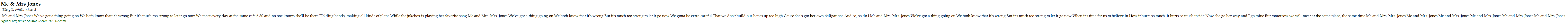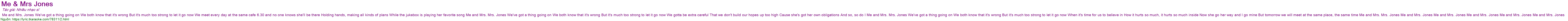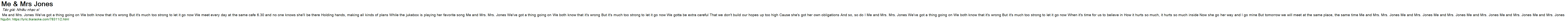 Me and Mrs. Jones We've got a thing going on We both know that it's wrong But it's much too strong to let it go now We meet every day at the same cafe 6.30 and no one knows she'll be there Holding hands, making all kinds of plans While the jukebox is playing her favorite song Me and Mrs. Mrs. Jones We've got a thing going on We both know that it's wrong But it's much too strong to let it go now We gotta be extra careful That we don't build our hopes up too high Cause she's got her own obligations And so, so do I Me and Mrs. Mrs. Jones We've got a thing going on We both know that it's wrong But it's much too strong to let it go now When it's time for us to believe in How it hurts so much, it hurts so much inside Now she go her way and I go mine But tomorrow we will meet at the same place, the same time Me and Mrs. Mrs. Jones Me and Mrs. Jones Me and Mrs. Jones Me and Mrs. Jones Me and Mrs. Jones Me and Mrs. Jones