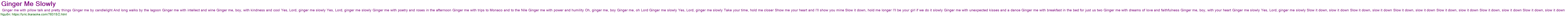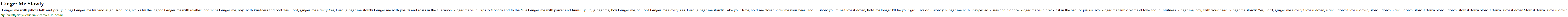 Ginger me with pillow talk and pretty things Ginger me by candlelight And long walks by the lagoon Ginger me with intellect and wine Ginger me, boy, with kindness and cool Yes, Lord, ginger me slowly Yes, Lord, ginger me slowly Ginger me with poetry and roses in the afternoon Ginger me with trips to Monaco and to the Nile Ginger me with power and humility Oh, ginger me, boy Ginger me, oh Lord Ginger me slowly Yes, Lord, ginger me slowly Take your time, hold me closer Show me your heart and I'll show you mine Slow it down, hold me longer I'll be your girl if we do it slowly Ginger me with unexpected kisses and a dance Ginger me with breakfast in the bed for just us two Ginger me with dreams of love and faithfulness Ginger me, boy, with your heart Ginger me slowly Yes, Lord, ginger me slowly Slow it down, slow it down Slow it down, slow it down Slow it down, slow it down Slow it down, slow it down Slow it down, slow it down Slow it down, slow it down