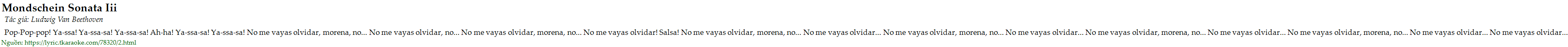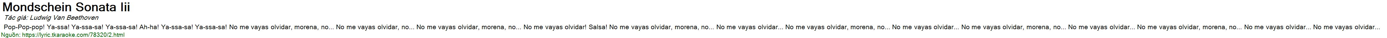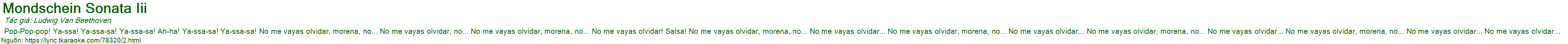 Pop-Pop-pop! Ya-ssa! Ya-ssa-sa! Ya-ssa-sa! Ah-ha! Ya-ssa-sa! Ya-ssa-sa! No me vayas olvidar, morena, no... No me vayas olvidar, no... No me vayas olvidar, morena, no... No me vayas olvidar! Salsa! No me vayas olvidar, morena, no... No me vayas olvidar... No me vayas olvidar, morena, no... No me vayas olvidar... No me vayas olvidar, morena, no... No me vayas olvidar... No me vayas olvidar, morena, no... No me vayas olvidar... No me vayas olvidar...