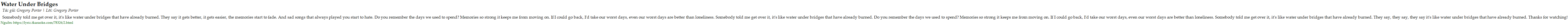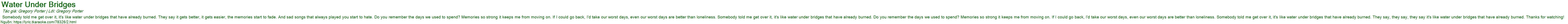 Somebody told me get over it, it's like water under bridges that have already burned. They say it gets better, it gets easier, the memories start to fade. And sad songs that always played you start to hate. Do you remember the days we used to spend? Memories so strong it keeps me from moving on. If I could go back, I'd take our worst days, even our worst days are better than loneliness. Somebody told me get over it, it's like water under bridges that have already burned. Do you remember the days we used to spend? Memories so strong it keeps me from moving on. If I could go back, I'd take our worst days, even our worst days are better than loneliness. Somebody told me get over it, it's like water under bridges that have already burned. They say, they say, they say it's like water under bridges that have already burned. Thanks for watching!