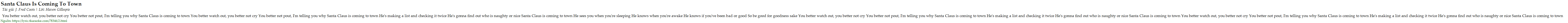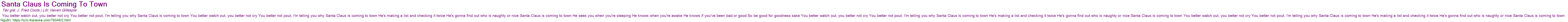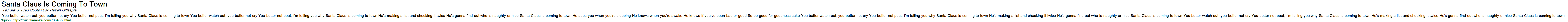 You better watch out, you better not cry You better not pout, I'm telling you why Santa Claus is coming to town You better watch out, you better not cry You better not pout, I'm telling you why Santa Claus is coming to town He's making a list and checking it twice He's gonna find out who is naughty or nice Santa Claus is coming to town He sees you when you're sleeping He knows when you're awake He knows if you've been bad or good So be good for goodness sake You better watch out, you better not cry You better not pout, I'm telling you why Santa Claus is coming to town He's making a list and checking it twice He's gonna find out who is naughty or nice Santa Claus is coming to town You better watch out, you better not cry You better not pout, I'm telling you why Santa Claus is coming to town He's making a list and checking it twice He's gonna find out who is naughty or nice Santa Claus is coming to town