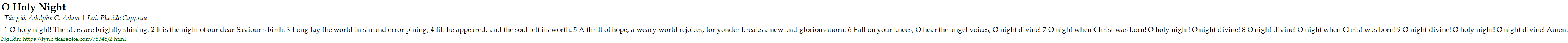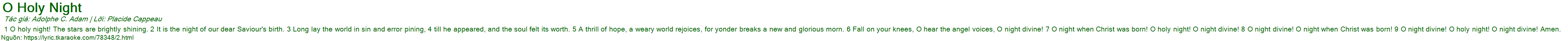1 O holy night! The stars are brightly shining. 2 It is the night of our dear Saviour's birth. 3 Long lay the world in sin and error pining, 4 till he appeared, and the soul felt its worth. 5 A thrill of hope, a weary world rejoices, for yonder breaks a new and glorious morn. 6 Fall on your knees, O hear the angel voices, O night divine! 7 O night when Christ was born! O holy night! O night divine! 8 O night divine! O night when Christ was born! 9 O night divine! O holy night! O night divine! Amen.