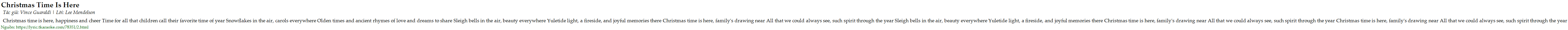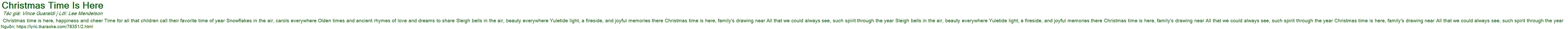 Christmas time is here, happiness and cheer Time for all that children call their favorite time of year Snowflakes in the air, carols everywhere Olden times and ancient rhymes of love and dreams to share Sleigh bells in the air, beauty everywhere Yuletide light, a fireside, and joyful memories there Christmas time is here, family's drawing near All that we could always see, such spirit through the year Sleigh bells in the air, beauty everywhere Yuletide light, a fireside, and joyful memories there Christmas time is here, family's drawing near All that we could always see, such spirit through the year Christmas time is here, family's drawing near All that we could always see, such spirit through the year