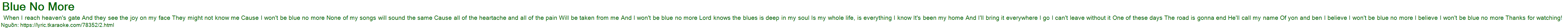 When I reach heaven's gate And they see the joy on my face They might not know me Cause I won't be blue no more None of my songs will sound the same Cause all of the heartache and all of the pain Will be taken from me And I won't be blue no more Lord knows the blues is deep in my soul Is my whole life, is everything I know It's been my home And I'll bring it everywhere I go I can't leave without it One of these days The road is gonna end He'll call my name Of yon and ben I believe I won't be blue no more I believe I won't be blue no more Thanks for watching!