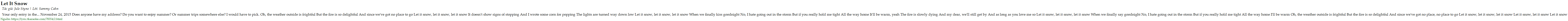 Your only entry in the... November 24, 2015 Does anyone have my address? Do you want to enjoy summer? Or summer trips somewhere else? I would have to pick. Oh, the weather outside is frightful But the fire is so delightful And since we've got no place to go Let it snow, let it snow, let it snow It doesn't show signs of stopping And I wrote some corn for popping The lights are turned way down low Let it snow, let it snow, let it snow When we finally kiss goodnight No, I hate going out in the storm But if you really hold me tight All the way home It'll be warm, yeah The fire is slowly dying And my dear, we'll still get by And as long as you love me so Let it snow, let it snow, let it snow When we finally say goodnight No, I hate going out in the storm But if you really hold me tight All the way home I'll be warm Oh, the weather outside is frightful But the fire is so delightful And since we've got no place, no place to go Let it snow, let it snow, let it snow Let it snow, let it snow Let it snow