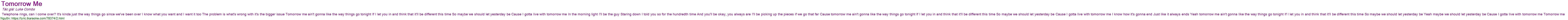 Telephone rings, can I come over? It's kinda just the way things go since we've been over I know what you want and I want it too The problem is what's wrong with it's the bigger issue Tomorrow me ain't gonna like the way things go tonight If I let you in and think that it'll be different this time So maybe we should let yesterday be Cause I gotta live with tomorrow me In the morning light I'll be the guy Staring down I told you so for the hundredth time And you'll be okay, you always are I'll be picking up the pieces if we go that far Cause tomorrow me ain't gonna like the way things go tonight If I let you in and think that it'll be different this time So maybe we should let yesterday be Cause I gotta live with tomorrow me I know how it's gonna end Just like it always ends Yeah tomorrow me ain't gonna like the way things go tonight If I let you in and think that it'll be different this time So maybe we should let yesterday be Yeah maybe we should let yesterday be Cause I gotta live with tomorrow me Tomorrow me