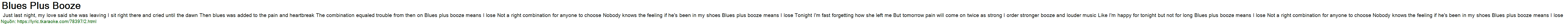 Just last night, my love said she was leaving I sit right there and cried until the dawn Then blues was added to the pain and heartbreak The combination equaled trouble from then on Blues plus booze means I lose Not a right combination for anyone to choose Nobody knows the feeling if he's been in my shoes Blues plus booze means I lose Tonight I'm fast forgetting how she left me But tomorrow pain will come on twice as strong I order stronger booze and louder music Like I'm happy for tonight but not for long Blues plus booze means I lose Not a right combination for anyone to choose Nobody knows the feeling if he's been in my shoes Blues plus booze means I lose