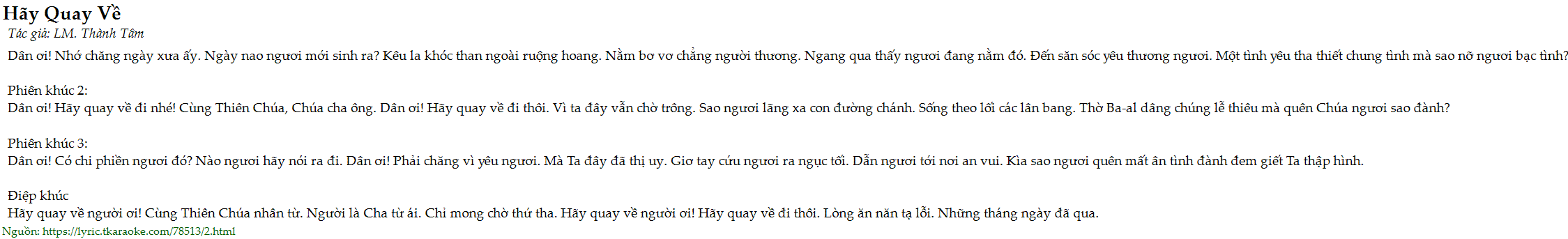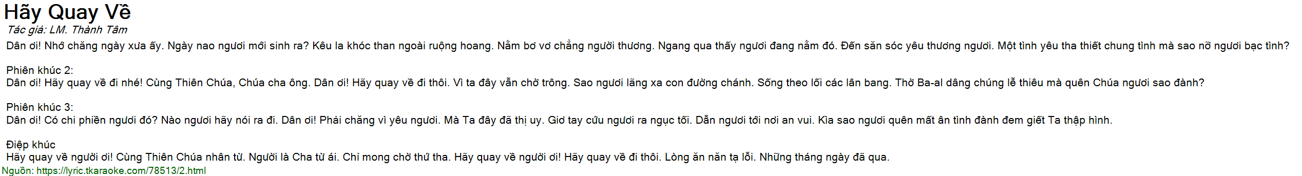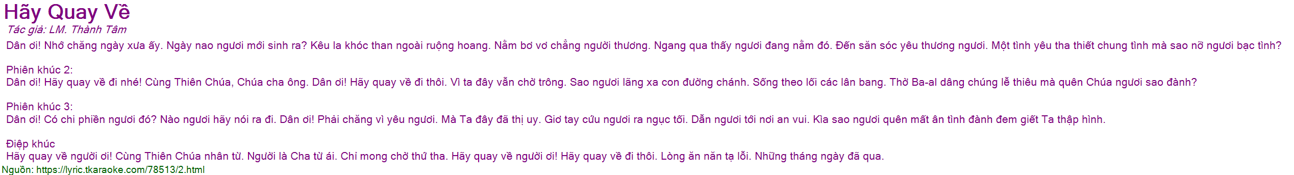 Hãy quay về người ơi! Cùng Thiên Chúa nhân từ. Người là Cha từ ái. Chỉ mong chờ thứ tha. Hãy quay về người ơi! Hãy quay về đi thôi. Lòng ăn năn tạ lỗi. Những tháng ngày đã qua.