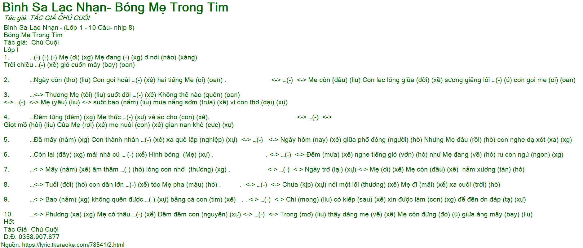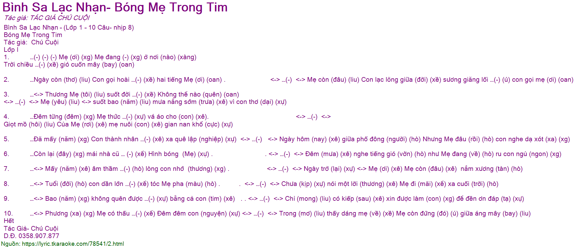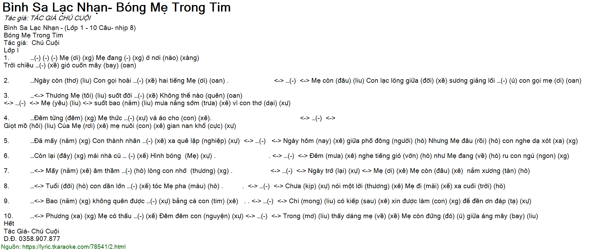 2. …Ngày còn (thơ) (liu) Con gọi hoài …(-) (xề) hai tiếng Mẹ (ơi) (oan) . <-> …(-) <-> Mẹ còn (đâu) (liu) Con lạc lõng giữa (đời) (xề) sương giăng lối …(-) (ú) con gọi mẹ (ơi) (oan)
