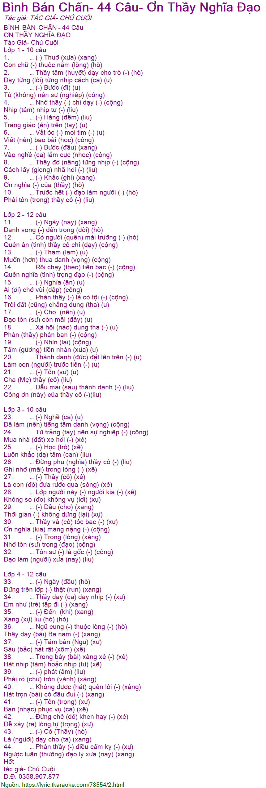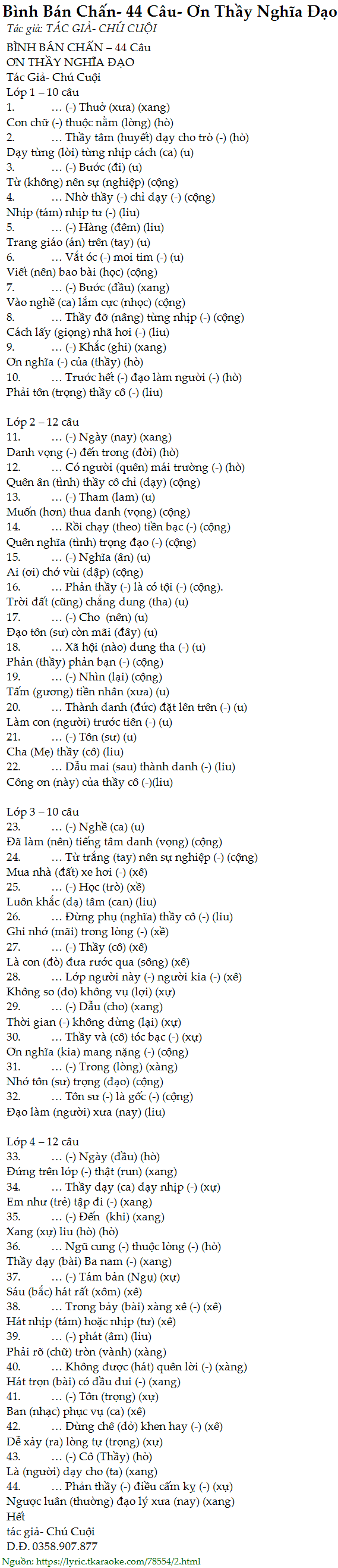 26. … Đừng phụ (nghĩa) thầy cô (-) (liu)